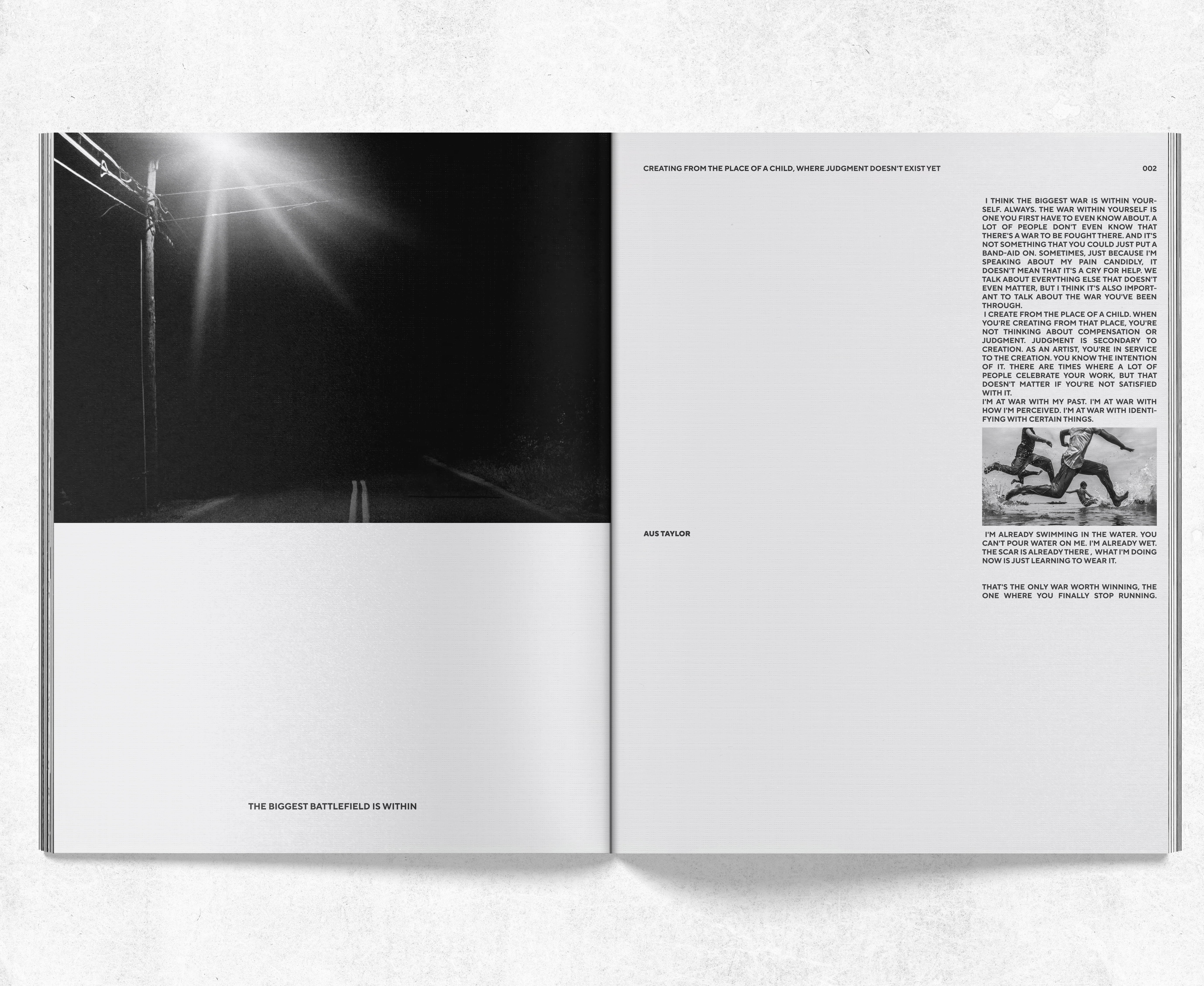 I handled everything from the ground up, developing the editorial concept, narrative arc, and visual language, designing all spreads, typographic layouts, and the publication's grid system, directing the photographic tone and mood, curating image selection and sequencing, and setting the hierarchy, pacing, and rhythm across each spread to balance image weight with text.